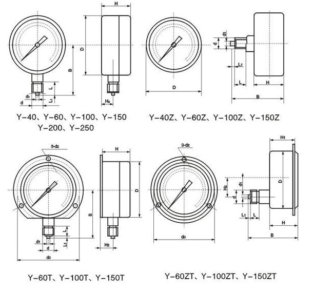 儀表的測量系統(tǒng)由接頭、彈簧和傳動機構(gòu)組成。通過指針指示儀表讀數(shù)。